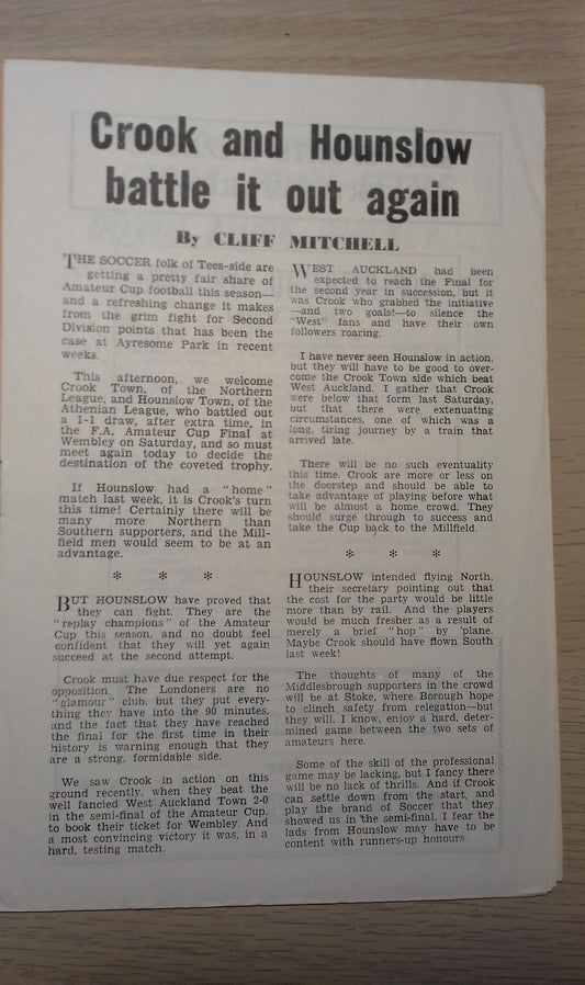 Crook Town v Hounslow Town Match Programme F.A. Amateur Cup Final Replay Sat.April 21st 1962 @ Ayresome Park.
