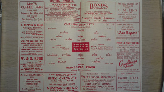 Chelmsford City v Mansfield Town Programme F.A. Cup 2nd Round Saturday December 9th 1950.