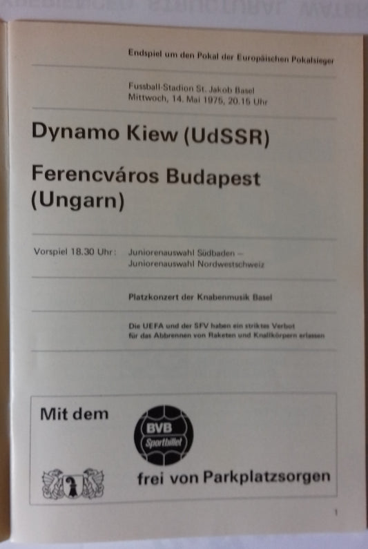 Dynamo Kiev v Ferencvaros Used Programme European Cup Winners Cup Final 14/5/1975 Basel