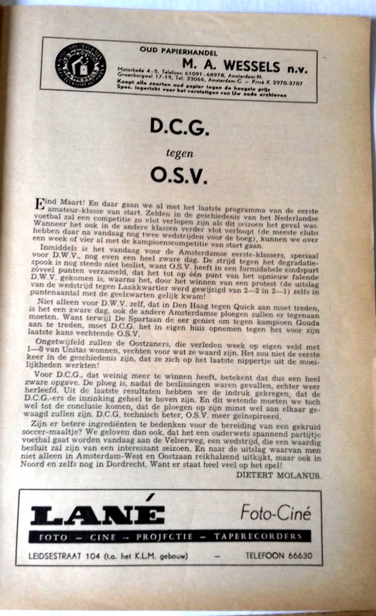 D.C.G. v O.S.V. Football Match Programme Eerste Klass A Amateur 27th March 1960.