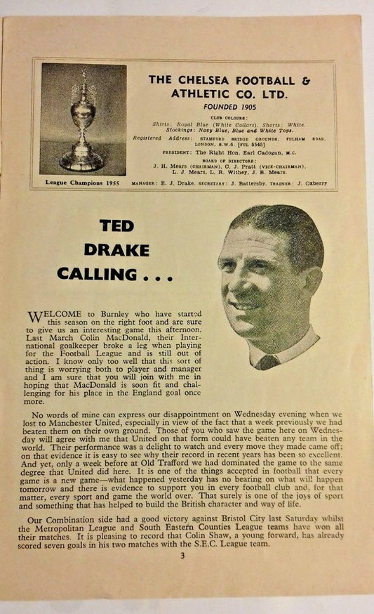 Chelsea v Burnley Football Match Programme Division 1 (Burnley Championship Season) 5/9/1959.