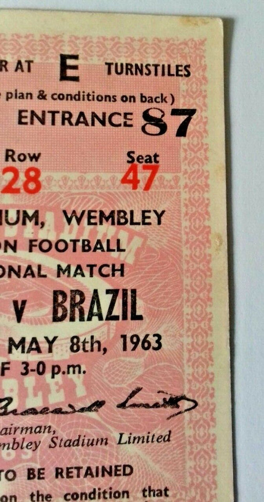 England v Brazil Int. Football Match Ticket Wednesday May 8th 1963 Wembley.