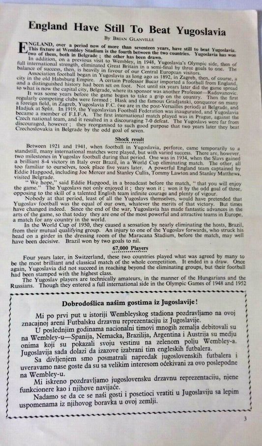 England v Yugoslavia Match Programme Wednesday Nov 28th 1956 Wembley Stadium