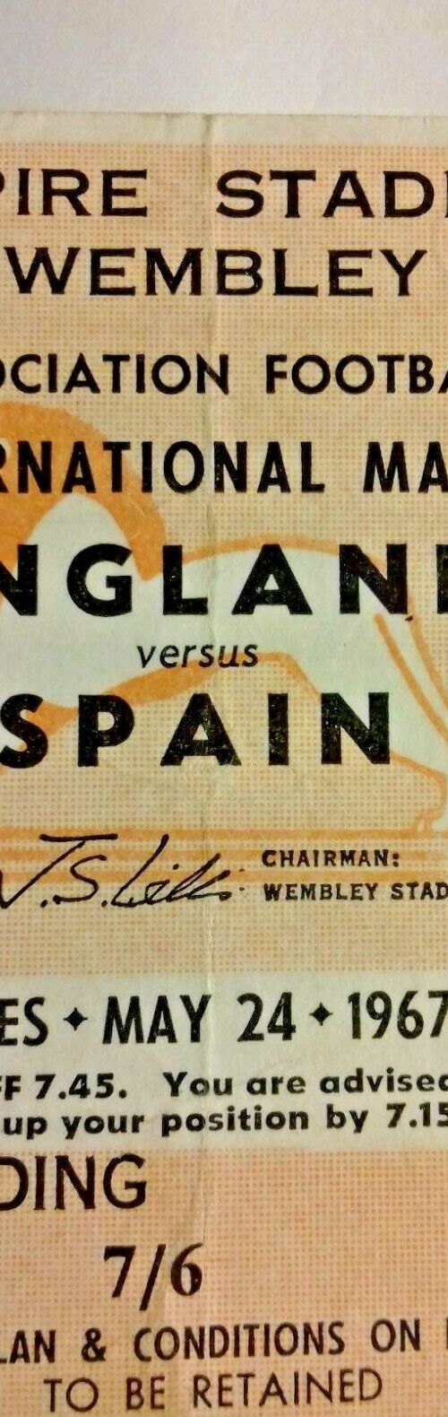 England v Spain International Football Match Ticket Wednesday 24th May 1967 Wembley.