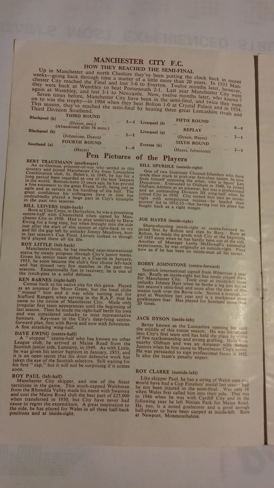 Manchester City v Tottenham Hotspur F.A. Cup Semi-Final Programme Saturday March 17th 1956 Villa Park.