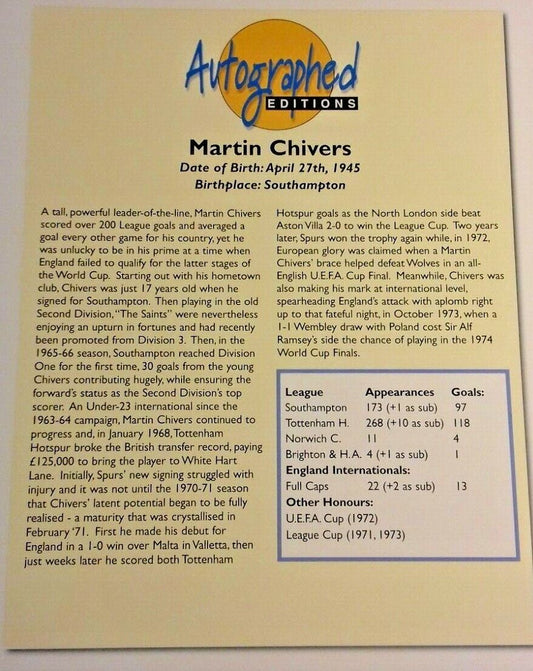 Martin Chivers Signed Autographed Photo From Autographed Editions.