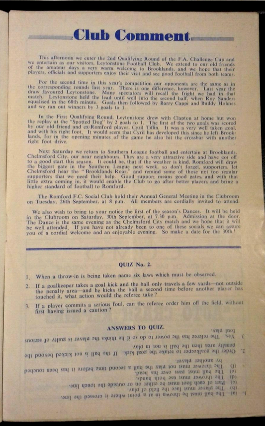 Romford v Leytonstone Match Programme F.A. Cup 2nd Qualifying Round 23/9/1961.