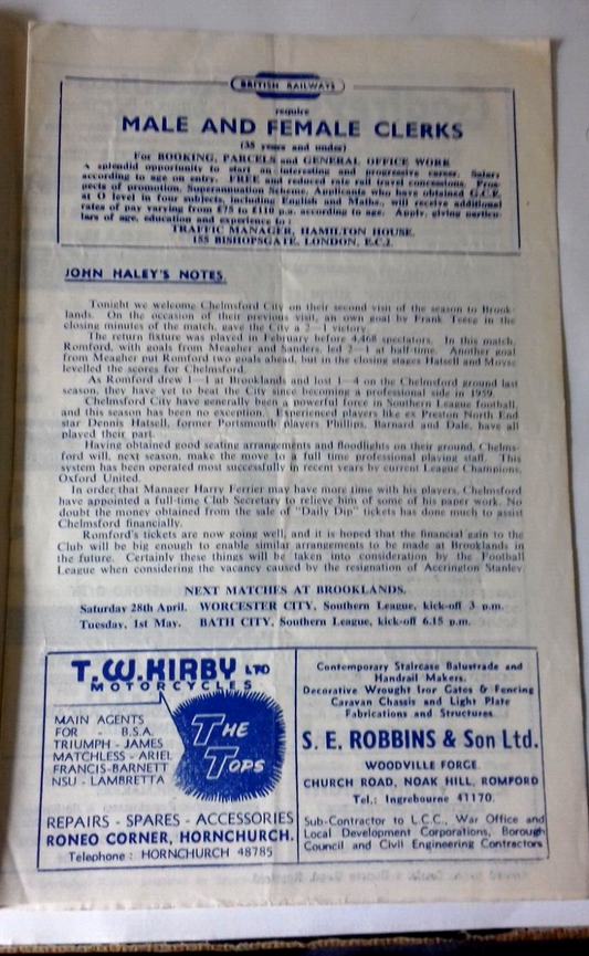 Romford v Chelmsford City Programme Reg Sheward Memorial Trophy 26th April 1962