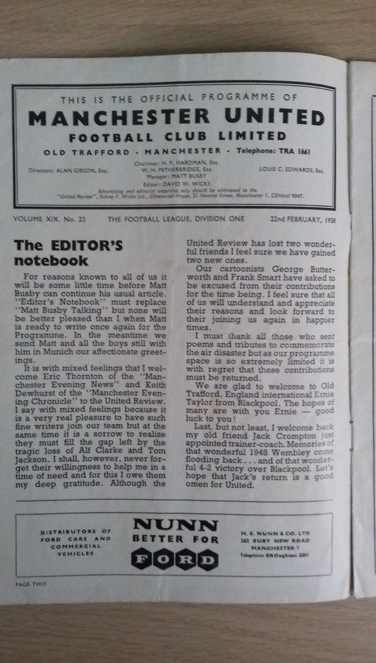 Manchester Utd v Nottingham Forest Programme 22nd February 1958 1st League Game After Munich Air Disaster