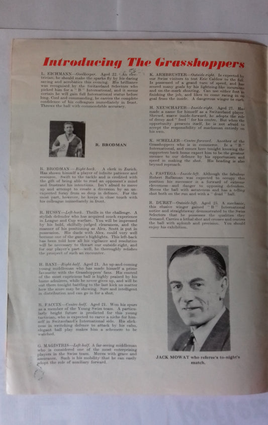 Rangers v Grasshoppers Zurich Used Vintage Souvenir Floodlight Programme 26/11/1958 Ibrox Stadium