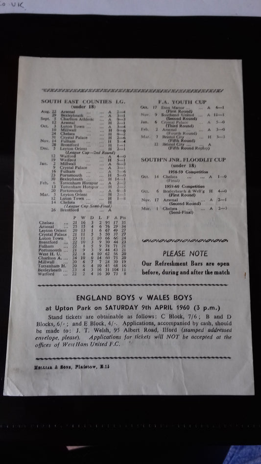 West Ham Utd Colts v Chelsea Colts South East Counties League Cup S/Final Mon. 14/3/60