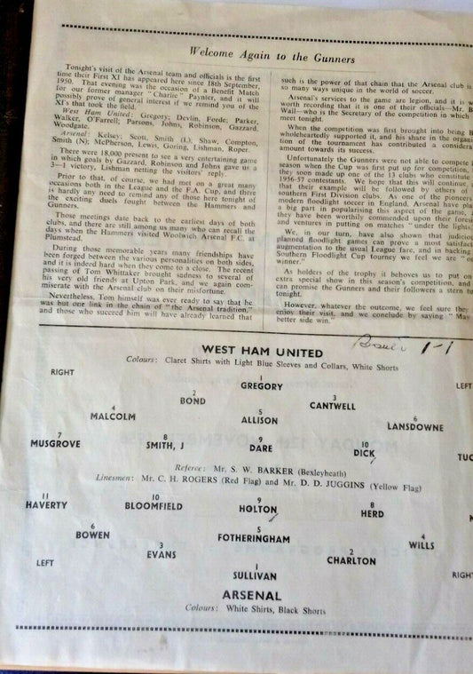 West Ham Utd v Arsenal Football Match Programme Southern Floodlight Cup 2nd Round. 12/11/1956 Upton Park.