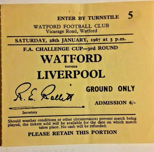 Watford v Liverpool Programme + Match Ticket F.A. Cup 3rd Round 28/1/1967.