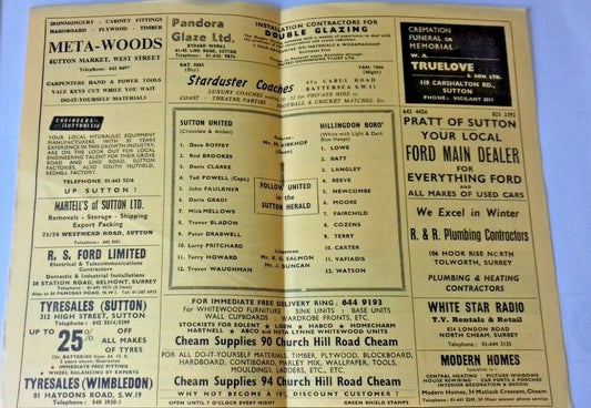 Sutton Utd v Hillingdon Boro Match Programme F.A. Cup 3rd Rnd. Replay 12/1/1970.