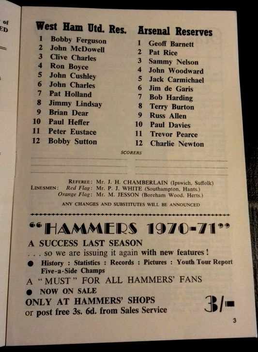 West Ham Reserves v Arsenal Reserves Football Match Football Comb Cup Final 1969/1970 1st Leg 24/8/1970.