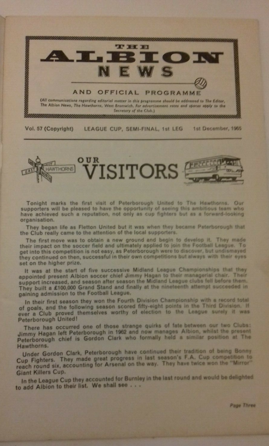 W.B.A. v Peterborough Utd Programme League Cup Semi-Final 1st Leg 1/12/1965