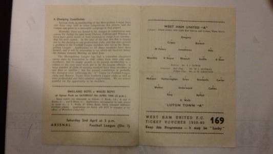 West Ham Utd A v Luton Town A Used Programme Metropolitan Cup Semi-Final Monday 28th March 1960