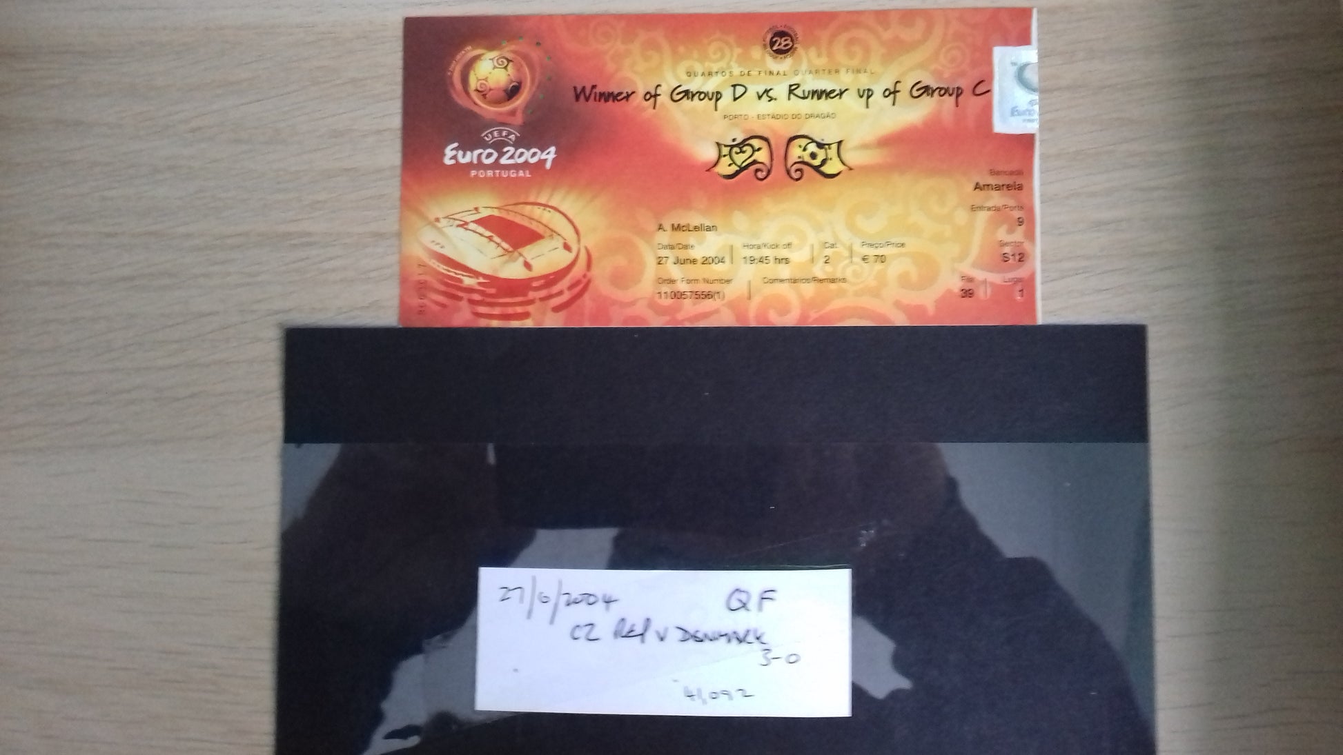 A match ticket for the Euro 2004 tie between Czech Republic and Denmark played in Porto 27th June 2004.