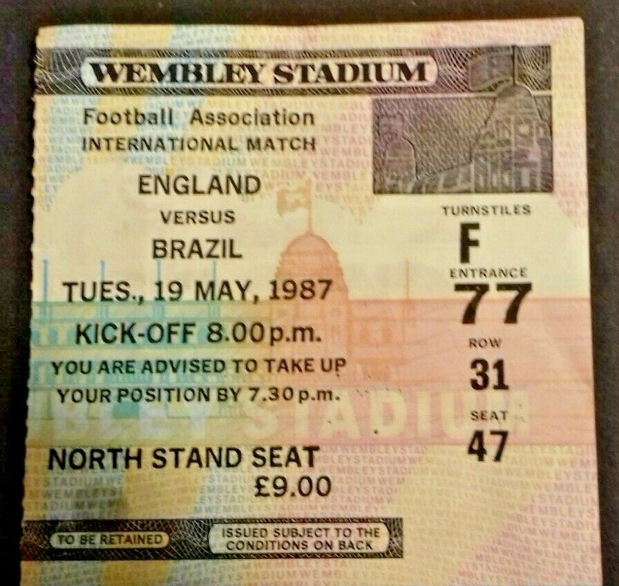 England v Brazil Rous Cup Match Ticket Tuesday 19th May1987 Wembley Stadium.